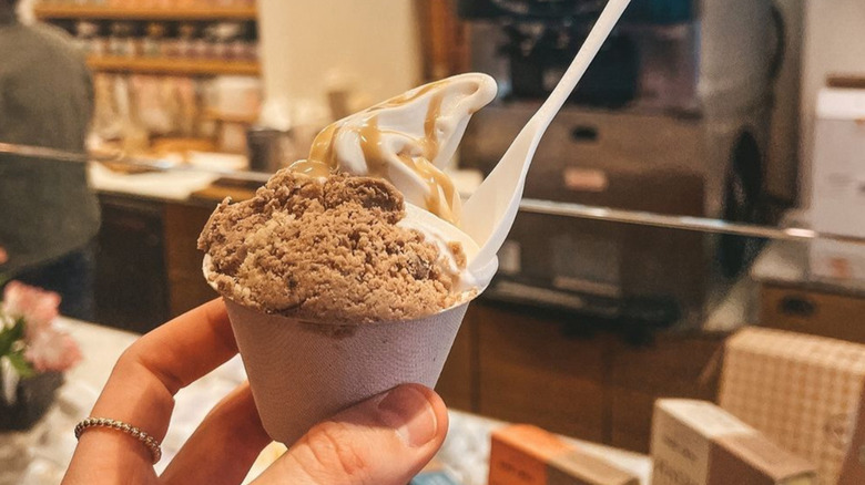 For a more traditional dessert experience, dive into the gluten-free and vegan soft-serve ice cream with various toppings in a cup or cone. The ice cream is known for its incredibly rich and creamy texture, and has a slightly savory rather than sweet undertone. That's because it's made from tahini and oat milk, for a super light and nutty texture and flavor. The iconic sundae starts with the swirled soft serve and is topped with halva crumbles for texture and a tahini drizzle for a perfectly nutty, creamy dessert delight. It's a pricey pick, but it's worth a splurge every so often.