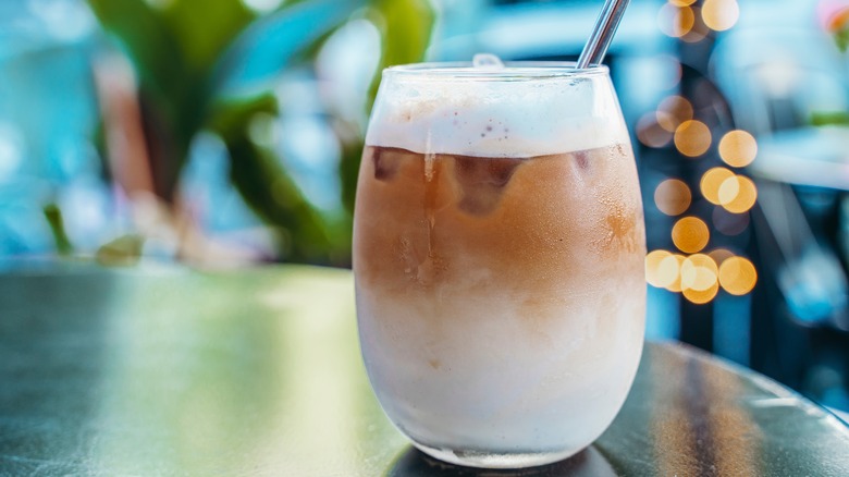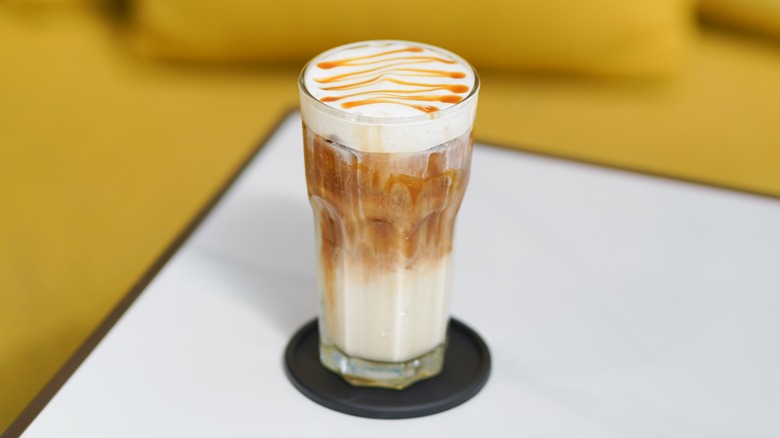 Starbucks has been whipping up its famous cold foam since 2014, but it wasn't until 2018 that it became available nationwide. Even then, nobody anticipated it'd become what it is today. From green, matcha cold foam to pink, cherry flavored cold foam, and from purple-hued lavender cold foam to chocolate, Starbucks' cold foam has evolved into a menu item in its own right, bringing color, flavor, and texture to all of its iced drinks. One of the most popular options, however, is Starbucks' salted caramel cold foam, made with just two additional ingredients you can easily recreate at home.