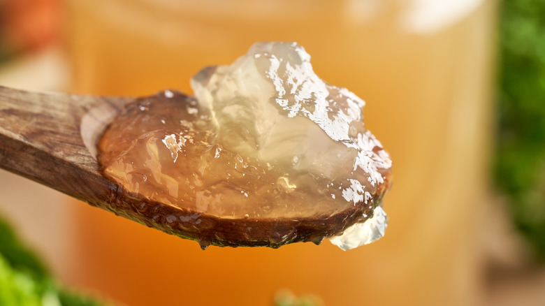 After you've mixed the gelatin into the stock, you'll need to let it chill undisturbed for a little bit to allow the gelatin to set (think about it like making a meaty Jell-O). Then, sieve the set gelatin into the meat with a mesh strainer to ensure that it is well-distributed.