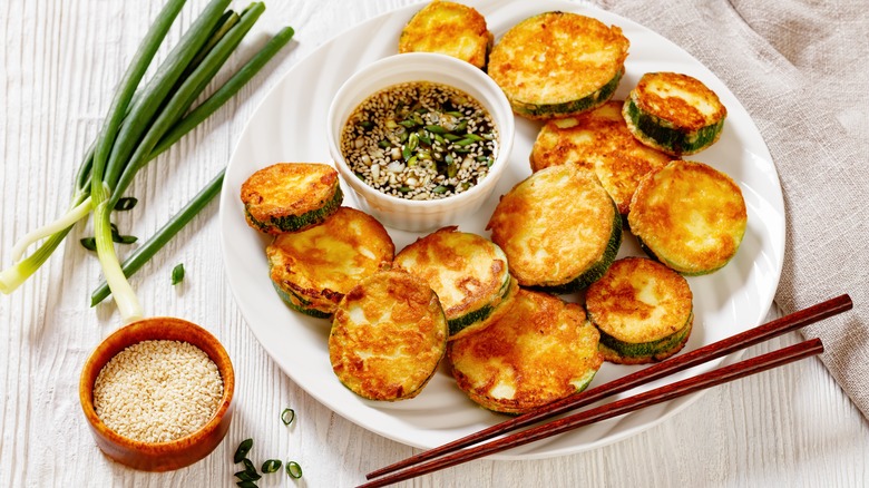Hobak jeon is popularly known as a celebratory dish and is most commonly served on both New Year's Day and Korean Thanksgiving (a harvest-season event called Chuseok). As with many Korean dishes, the simplicity of this side is what makes it so great. Zucchini is cut into slices, breaded, and fried in oil. It's the perfect side for a richer dish, to help balance out the stronger flavors.