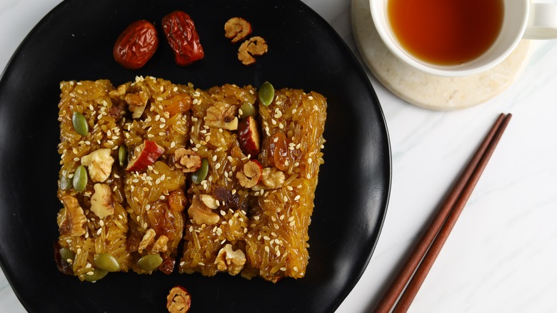 Yaksik is one of the few sweet dishes that you'll find on a Korean New Year's table, made up of sweet rice with dried fruits and nuts. This dessert has quite the legend behind it about a king and a crow, dating back to around 1,500 years ago. Yaksik in Korean can be translated to "medicinal food," which speaks to the reason that this food is typically served and enjoyed on this special holiday. The medicinal benefit of this sweet treat is thought to come from the addition of honey, which provides health upon entering the New Year.