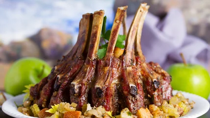 Since it's a roast, look for loins with the most even thickness to maintain uniformity. Once prepared, the pork crown roast can be filled with stuffing or roasted vegetables. To top its fanfare, carve up the roast tableside. Each resultant rib — one of around a dozen — contains a thick adherence of meat, meaning it'll only require one or two per person. Talk about a picture-perfect dinner optimized for a crowd!