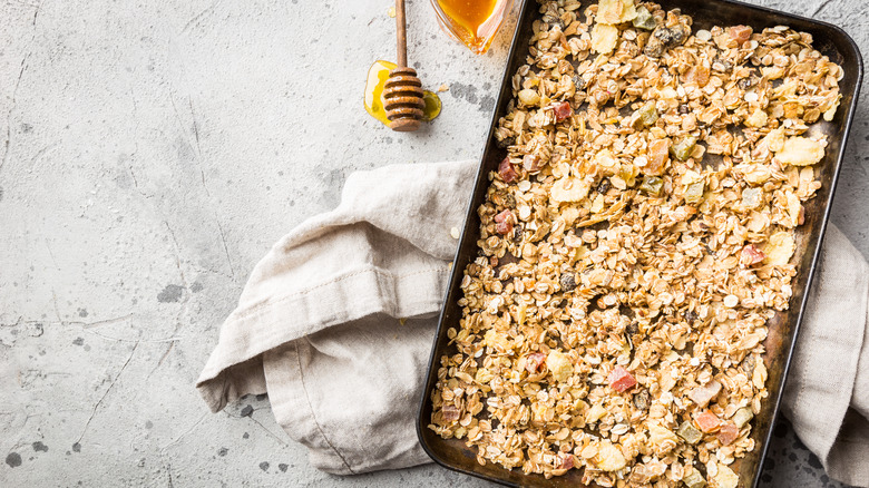 If you make homemade granola and notice that clusters are few and far between, you may not be pressing down on the mixture hard enough. A hard press is the key to perfectly formed granola and ensuring the texture is sublime. You'll want to keep the granola pieces close during baking rather than spreading them out sparsely on a baking tray. Reducing the surface area in the pan will encourage the sweeteners to permeate the layers of granola and force the pieces to stick together. To further encourage this process, use the back of a spatula and give the pieces a firm press before sliding the pan into the oven.
