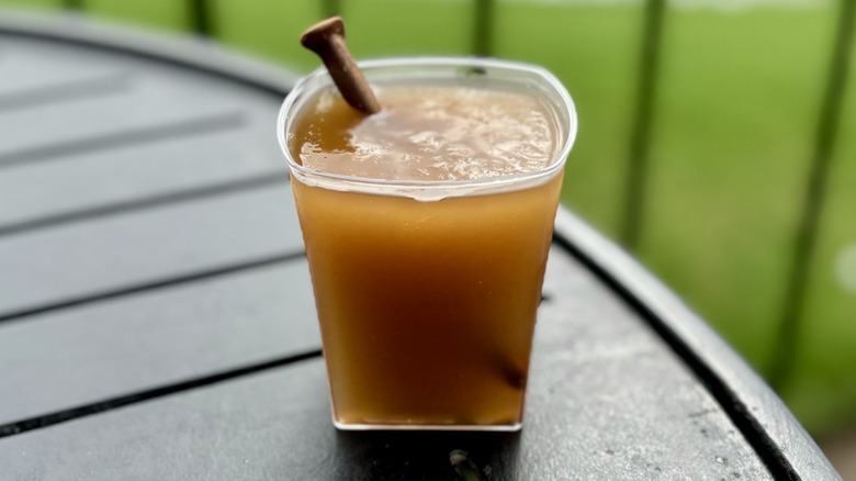 If you've enjoyed this one in the past, note that the chocolate nail remains, and it isn't just for show. It's coated in a shimmery substance that gives it a rusty appearance. When stirred into the drink, it releases a subtle glitter, enhancing both the look and taste of the cocktail with a touch of chocolate. The blend of herbal tea and scotch delivers a distinctive and strong taste. There are notes of apple, hinting it might be an apple-infused herbal tea. This cocktail is served from a slushie machine, which means it's fully mixed and perfectly chilled for a consistent experience.