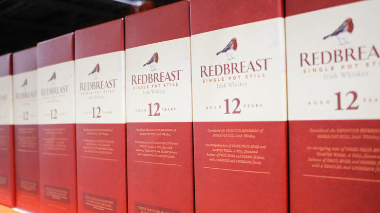 It wasn't until around 1903 that what would later become known as Redbreast came into existence. Gilbey's (which had been renamed from W&A Gilbey) introduced a new whiskey labeled John Jameson & Son's Castle "JJ Liqueur" Whiskey 12 Year Old, according to VinePair. Historians have noted that the bottle's shape and labeling bore a striking resemblance to Redbreast, so it's often considered the precursor to the now-famous Redbreast brand. The liquor used in this bottling was sourced from the same place where Jameson whiskey was formerly produced: the famous Bow Street Distillery in Smithfield, Dublin, per Master of Malt.