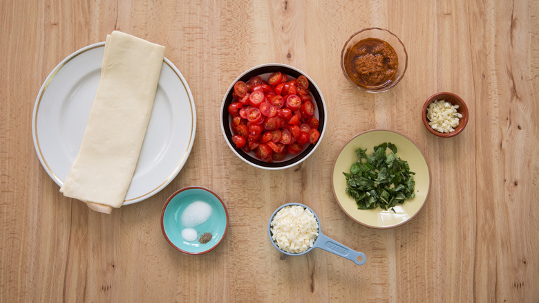 For this recipe, you will need sun-dried tomato pesto and grape tomatoes, which give these hearts their red color. The other filling ingredients you will need are salt, black pepper, Asiago cheese, garlic, extra virgin olive oil, and a few basil leaves. Finally, the recipe calls for a frozen puff pastry crust. Make sure to thaw it before you start preparing the recipe. You can thaw it by moving it to the refrigerator for 6-8 hours or letting it sit out on the counter for about half an hour.