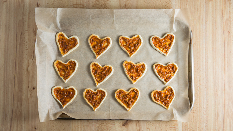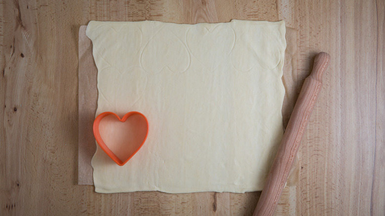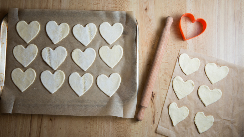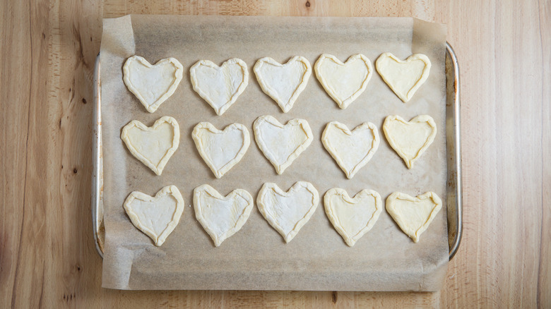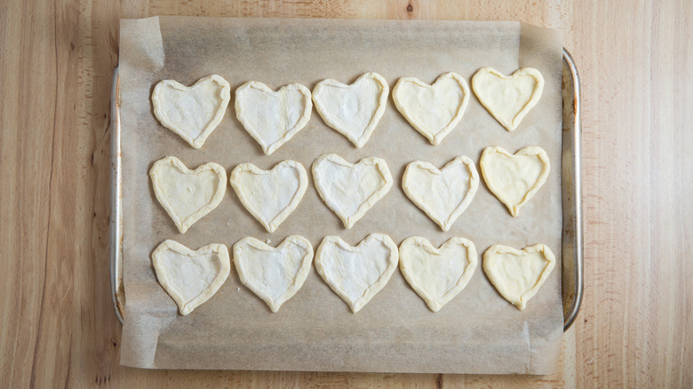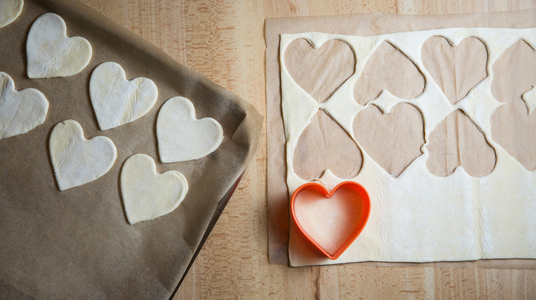 You don't have to miss out on these special pastries if you don't have a heart-shaped cookie cutter. You can easily make a heart stencil out of clean cardboard or cardstock. Cut the cardboard into a square that's the same height you want your tarts to be. Draw half a heart shape on it with the center of the heart on the folded edge of the cardboard. Make sure the rounded part of the heart touches the outer edges and the bottom point of the heart touches the center fold on the lower edge of the cardboard. Cut out the heart and unfold it, and you'll have a heart that's perfectly symmetrical on both sides. To use the stencil, place it on the pastry sheet and carefully cut around it with a paring knife.