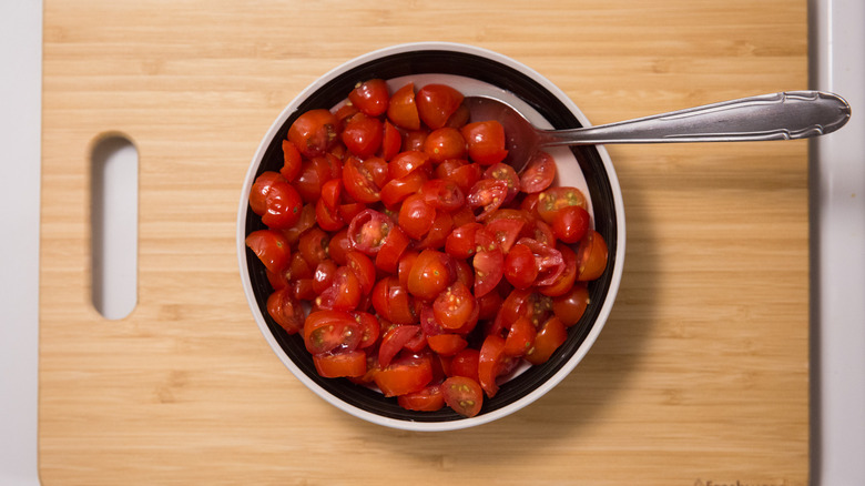 - Place the tomatoes in a small bowl with ¼ teaspoon salt and mix well. Set the bowl aside to allow the salt to draw extra moisture out of the tomatoes while you prepare the dough.