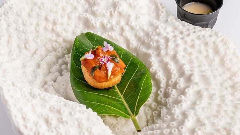 One example of that is a dish called sadya, inspired by a celebratory meal of various vegetarian delights served on a banana leaf in Kerala during the first harvest season. Eaten during the second course here at Trèsind Studio (in the Deccan plateau region section), chef Saini's version breaks the sadya down into a more simplified affair. However, a component of each of the 25 dishes is still present and plated one by one in front of the diner. Growing up in an agricultural family in Old Dehli, chef Saini says that the sadya holds a special place in his heart. "For me, it is symbolic of community bonding and represents the true spirit of Indian culture," he says. "We intend to bring out the same emotions of a sadya. It has had an emotional impact on some of our guests."