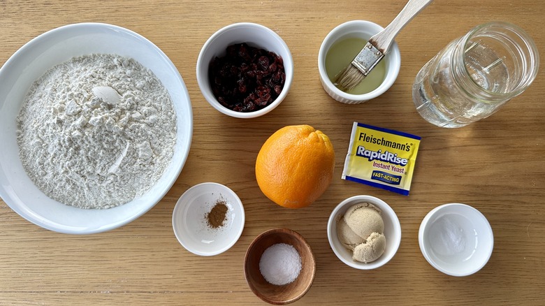 For this homemade bagel recipe, you'll need light brown sugar, a packet of instant yeast, bread flour, and kosher salt. Next, get dried cranberries (roughly chopped), ground cinnamon, orange zest, baking soda, and a large egg white (beaten). If desired, pick toppings such as quick oats, poppy seeds, and everything bagel seasoning to garnish.