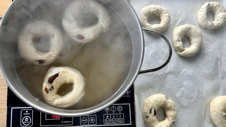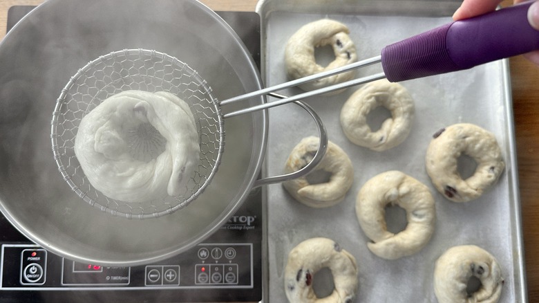 Another element that can play a significant role in the outcome of your dough is the weather. "Yeast will be more active in warmer temperatures, meaning it will rise more quickly. In colder months, it may take longer for the dough to double in size, but it's important to wait until that point is reached, no matter how long it takes," Rosenhouse notes. Finally, don't skip the baking soda and brown sugar bath, which she uses to "create a caramelized, crisp crust that rivals any bagel you'll get at a bagel shop."