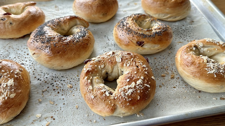To ensure your bagels retain their freshness, Rosenhouse says, "Store bagels at room temperature in an airtight container for up to 2 days." Alternatively, if you want to prep a batch to keep for several weeks, she says you can freeze them — "sliced in half for quick toasting" — for up to 2 months.