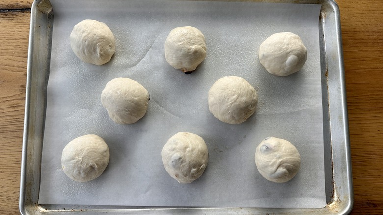 - Once risen, transfer dough to a clean surface and divide into 8 equal sections.