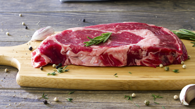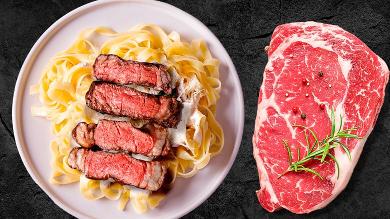 Steak and pasta are two of the most hearty, satisfying dinners you can make, so why not combine the two? While ground beef or salted pork may be the meats more associated with pasta — like in popular dishes such as Bolognese and amatriciana — steak can make a fantastic upgrade to plenty of existing recipes. Whether it's a creamy mushroom sauce or a tangy puttanesca, the meaty, rich flavor of steak is versatile enough to serve as a protein topping that makes your pasta a little more filling and special. You just have to make sure you use the right cut, because not every steak is going to compliment your pasta experience without feeling out of place. If you want to do pasta and steak right, we are going to recommend ribeye.