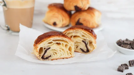 With tender flaky layers of pastry wrapped around dark chocolate, these pain au chocolate are as tasty as the traditional version, but require much less work.