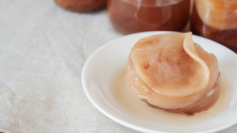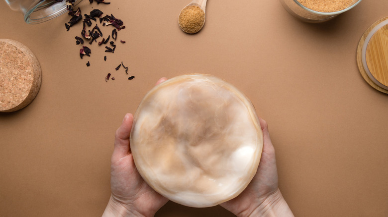 Getting your hands on a kombucha SCOBY is actually easier than you might think. While plenty of online home-brewing stores will sell and ship SCOBY directly to you, you'll save money by either getting one from a friend who makes kombucha or making one yourself. If you know someone who actively makes kombucha at home, ask them if they have any extra SCOBY they're willing to part with. Like the mother of vinegar, SCOBY grows constantly and exponentially with each batch of kombucha made, so over time, every home-brewer will end up with an excess of SCOBY that can be trimmed off and disposed of, consumed, or given away.