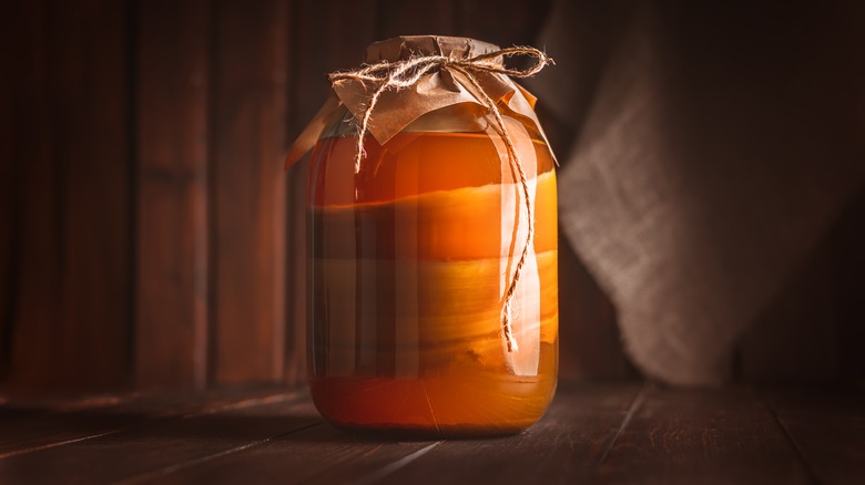 When your sweetened tea is made and brought to the proper temperature, you're ready to begin the first of two fermentation cycles, commonly called "F1." Simply pour your ready-made tea into your clean and dry brewing vessel and add your SCOBY and starter tea to the mix. The mixing of the starter tea into a new batch of kombucha is called "backslopping," which the Fermentation Association refers to as "the practice of saving a bit of the last successful batch and incorporating it into the new one." Backslopping ensures your new batch is inoculated with enough of the right microbes for successful fermentation. Finally, secure your clean cloth over the top of your brewing vessel with the rubber band, label it with the date, and store it in a warm place in your kitchen.