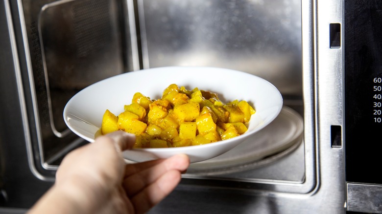 You can also use the stovetop to crisp up the potatoes — heat up oil in a pan over medium-high heat, then add the potatoes and cook for about 10 minutes or until they've reached your desired crispiness. Once you've quickly and successfully whipped up a batch of crispy potatoes, you're all set to pair them with any dish of your choosing — perhaps pan-fried chicken thighs, miso-teriyaki salmon, or soft and fluffy scrambled eggs for a breakfast option.