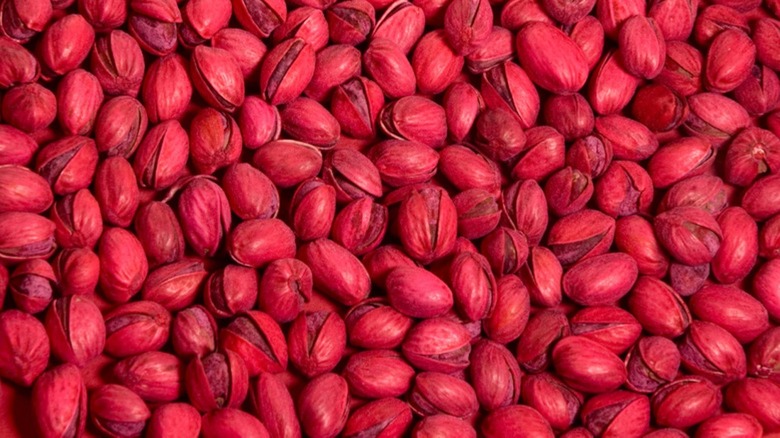 There are two main theories for how American pistachios ended up red, and they may even overlap with each other to some degree. The story that seems to have the most support from experts and historians is that the shells were dyed red to cover up imperfections. Prior to the 1980s, most pistachios sold in this country were imported from Iran and, to a lesser extent, from other countries in the Middle East. When speaking to HuffPost, the executive director of American Pistachio Growers said that the way the nuts were harvested would cause splotchy stains on the shells, and the red dye helped make them more visually appealing for sale. But, not every source agrees with this account completely.