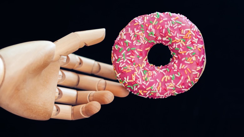 Some weird images are artifacts of another era — literally, in the eyes of this semi-robotic donut beholder. This picture represents a time before we perfected apps that crop images for you on your phone, when cropping a donut was a challenge that required an hour with a pen tool, and you still had aliasing all around your breakfast pastry. And then, just for, like ... reasons, y'know? ... the designer added an artist's mannequin reaching for it. What does this say about us as a society — that we don't allow human models to eat junk food? Deep.