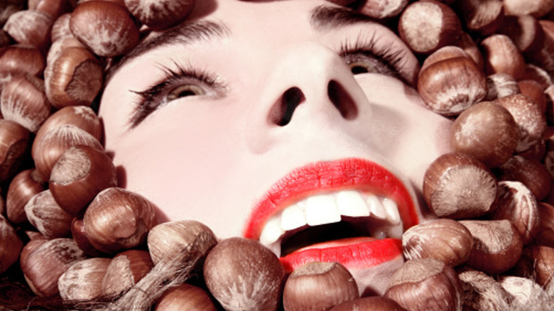 You can die from eating too much of even the healthiest food. If you fail to eat an extremely large volume of it fast enough, you'll succumb to the sheer weight of it cascading upon you, as appears to be happening here. That, or she might just be getting covered and smothered in hazelnuts so quickly that she's asphyxiating long before the weight of the nut avalanche crushes her. What's another horrible way that hazelnuts invite us to perish in a nut-lover's monkey's paw wish gone wrong? That's right, choking! You're good at this. Anyway, this picture is bizarre.