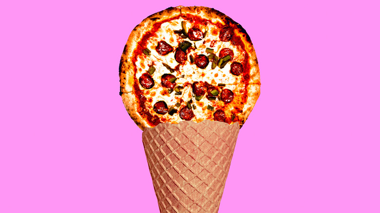 We're not scratching our heads because somebody silhouetted a pizza and pasted it atop an ice cream cone, or even that they did it at the weirdest angle to eat such a creation. No, we're scratching our heads because the genius of this concept is only dawning on us now — this is an excellent way to let the grease run off your pizza for collection in a delicious sugar-cone shot glass. That sounds delicious! Maybe pizza-fat shooters are the food trend 2024 needs. Turns out this one's a head-scratcher because nobody thought to do it earlier.