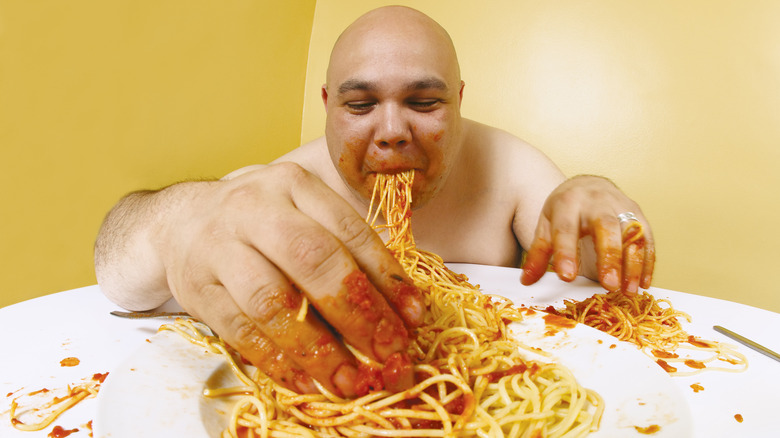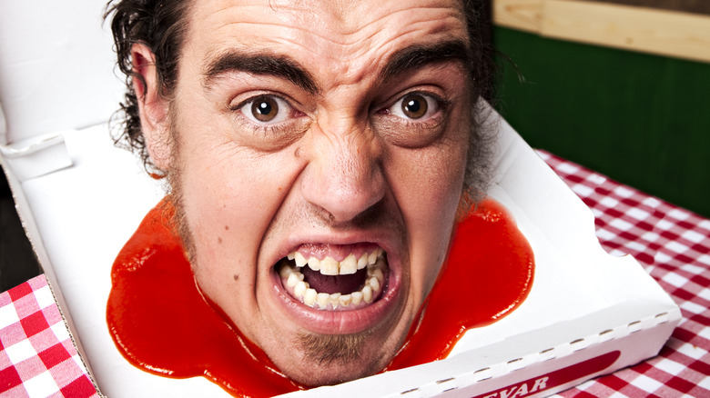 For a photo intended to just be "gluttonous man devours universally beloved meal," this photo sure is selling "adult baby makes mess until scolded," isn't it? When we started this article, we knew things would get weird, but we weren't prepared for it to repeatedly end with, "And that was somebody's personal private tastes." Good luck ever seeing this photo — or most stock imagery — the same ever again, and sorry about the loss of your innocence.