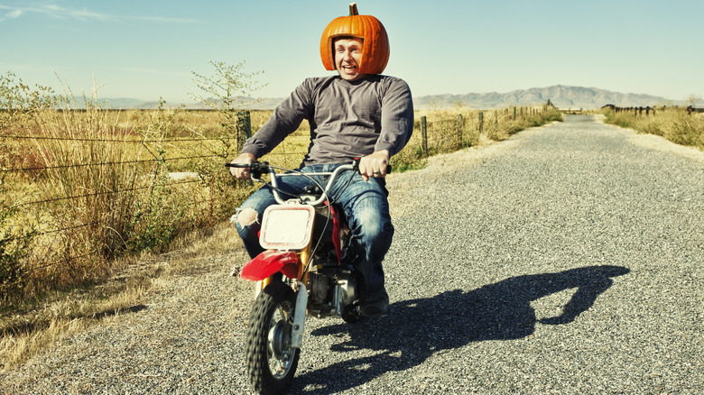 Look, any helmet is better than no helmet, but no helmet can be worse than a late-autumn pumpkin ... except for maybe a late-autumn pumpkin that doesn't have one side carved out so you can see where you're going. Thankfully, this dirt bike looks like its top speed is 10 mph, well within federal guidelines for gourd-based head protection. Still, perhaps this rider should have repurposed an old jack o' lantern instead to add some face protection.