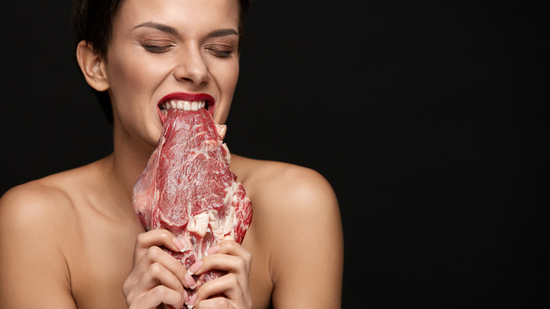We're fans of raw meat specialties ourselves, whether it's snapper crudo, carpaccio, steak tartare, or beef kitfo ... but tearing into it like a wolf? Disrespectful. Everyone knows that once you're rending chops with gnawing teeth and bare hands, it should be cooked, minimum, to 120 degrees Fahrenheit. This feels like what happens to the Bewildered Salad Woman as she explores her new wants and needs beyond leafy greens.