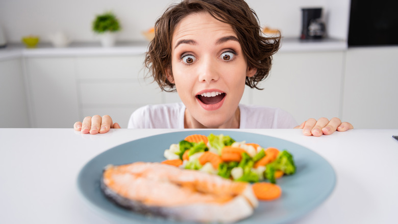 Nobody's judging this model for liking salmon. Salmon is delicious. It's not the desire, but the approach that has us weirded out. For starters, her focus is on the steamed veggies, and it's the blandest medley of carrots and cauliflower without herbs or oil, when everybody knows you need to roast cauliflower. So at the end of it, this is a grown woman slinking up to a plate of watery disappointment like it's the night before Christmas, and Healthy Santa is here to give out juicers and coupons for the holistic gym. Lame!