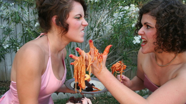 The leering angles ... the amateurish photography and lighting ... this isn't just a stock photo, is it? This is someone's thing. This is an attempt to surreptitiously insert a highly specific and unwholesome brand of excitement into the PG-rated world of stock photos. Look at the framing on that centerpiece of handheld spaghetti. Nobody scoops up a clawful like that unless they want it to be your focus. A normal person balls their bridal-party-brawl spaghetti in a clenched fist.