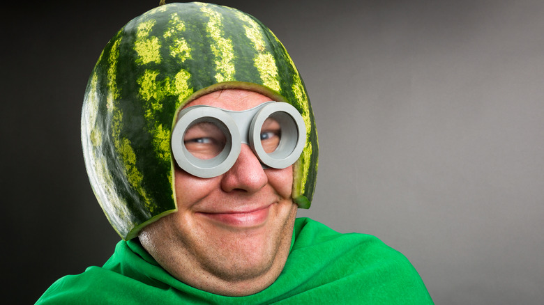 So which Minion is this? Making the pumpkin helmet look downright safe and sensible, this watermelon ensemble suggests a superhero that never was: a head-first juggernaut to team up with, and summarily burden, Bananaman. The obtuse fruit-themed crimefighter replaces the tragically deceased Pumpkin Rider, who smashed his head during the final battle against California Raisin for the Horn of Infinite Plenty. Don't mourn him. He'll be brought back to life in time to battle the Antioxidant Monitor in a big summer crossover. Or a fruit salad.
