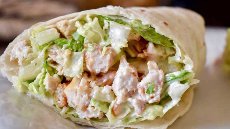 When you start considering all the culinary creations that can be made with Costco's products, it can get a bit overwhelming, not to mention bumping elbows with too many people on a busy afternoon. Even if you can snag a table, you don't want to toss on your apron and prep a whole meal right in the food court. But with one savvy addition, you can easily create the meal you want. One rotisserie chicken Caesar salad can become four or five chicken salad wraps, depending on how hefty your wraps are. Just snag a pack of tortillas before heading to the food court, and you can make culinary magic happen right at your table.