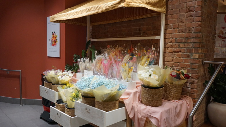 Straight ahead, you'll find pre-packaged items, like seltzer waters, salads, and seasonal items you can take to-go. Turn left, and you'll see the restaurant called Eataly, with diners chatting in booths, at tables, and at the spacious bar. At the end of the Lavazza coffee bar, you can continue straight to discover the cold grocery section, featuring specialty meats, cheeses, antipasti, and more refrigerated Italian food items. Keep traveling down the ramp to find the bountiful fruits and veggies, the flower stand to buy and make bouquets, and all the shelf-stable Italian grocery items like olive oil and dried pasta. Then, you'll see the Eataly to-go pickup counter, and you can turn left down the stairs (though there's also an elevator) to find the pop-up area (more on that soon).