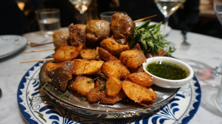 Aiming to get a rounded view of the menu at Eataly, we were glad to have tried so many varieties of pasta, meats, and sauces, so we could really see what this Italian restaurant could do. Everything was fresh, well-cooked, and beautifully presented. We would be remiss to forget to mention what was our star of the entrée show: The Fornello Pugliese. This dish was meant to be shared among about four people (more or less, depending on if you order other things), and the grilled Pugliese-style skewers were plated on the best potatoes we've ever had in our life, no joke. There was an herb and oil mixture on the side, and Borri skillfully took the bundle of herbs — meant to act as a brush — dipped it into the sauce, and draped it back and forth over both the meat skewers and the potatoes.
