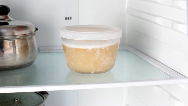 Your chicken stock can last in the refrigerator for three to four days, according to the U.S. Department of Agriculture. Of course, your fridge should be set at 40 degrees Fahrenheit or lower to prevent the growth of any bacteria (via USDA). The leftover store-bought chicken stock should be fine in the fridge in its original packaging. But if you cannot consume it all within four days, you'll need to transfer it to a freezer-safe container and store it in a freezer set at 0 degrees Fahrenheit or lower. This way it will last for two to three months in the freezer.