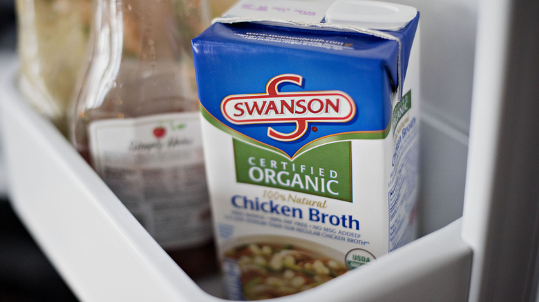 Using store-bought chicken stock is much easier than making it from scratch when you're cooking a pot of soup, boiling rice, or making risotto. One of the downsides to pre-made chicken stock, however, is that it often comes in a container that's at least 30 ounces. You probably don't need all of that flavorful stock for your recipe, but you don't want it to go to waste either. To prevent potential food waste, it's important to know how long the opened carton of store-bought chicken stock lasts before you need to toss it out, and how to spot signs of spoilage before you pour it in a pot with other ingredients.