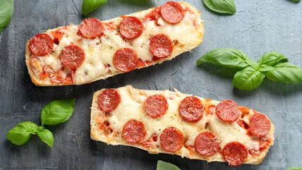 Cheese like mozzarella, ricotta, cheddar, and provolone melt quickly, and creating a blend of your favorites is an easy pizza topping that offers complex flavors. You can also opt for toppings that are pre-cooked, such as pepperoni slices or bacon bits. For a vegetarian version, you may need to par-cook your pizza's veggie toppings. Sauté mushrooms and peppers for a few minutes before placing them on the garlic bread and baking it.