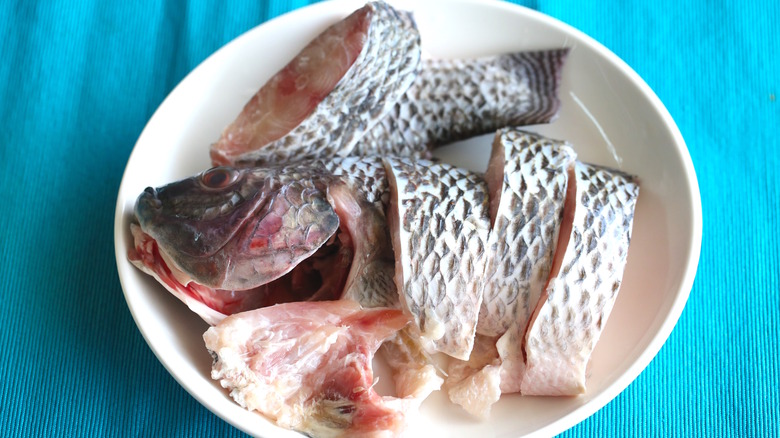 When it comes to building a stock, there's no limit as to what can be tossed into the pot. Along with a host of aromatics, any number of fish scraps can be used to season the liquid. That said, to avoid an overly oily or pungent broth, it's best to stick to the various bits and bones of white fish or the shells of sweet crustaceans like prawns and lobsters. But, even then, you might end up with a less-than-lip-smacking outcome. The culprit? Bloody bones.