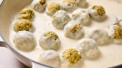 Chicken Florentine meatballs can be served on their own, but because they make up a simple dish of meat and cheese, they're best paired with carbs — try pasta, rice, or bread. Our favorite way to serve this take on Florentine is with pasta: Boil fettuccine or linguine until al dente, then add the noodles to the mornay sauce and toss to coat. For a more elegant presentation, swirl the noodles on a plate, add the meatballs on top, and drizzle with mornay. The result is a funky, rich, and filling alfredo. You can also do this with small pasta shapes, like rotini or fusilli.