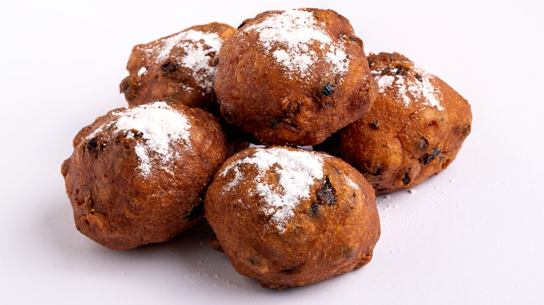 These proto-donuts were called olie koeken or olykoeks, meaning "oil cakes" in Dutch. Other sources find the treat referred to as oliebollen ("oil balls"). By whatever name, these fried beauties were humble cake balls stuffed with fruit or nut filling and fried in pork fat until golden brown. A recipe for "oliekoecken" can be found in a Dutch cookbook from the 17th century, detailing a simple, almost utilitarian ball of leavened yeast dotted with dried fruit. All they took to make were a few staple baking ingredients and a kettle of boiling oil, and at the time, their now-signature ring shape had yet to be invented.