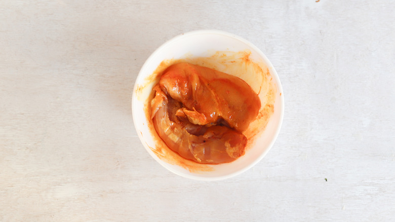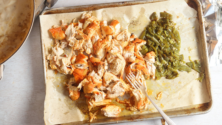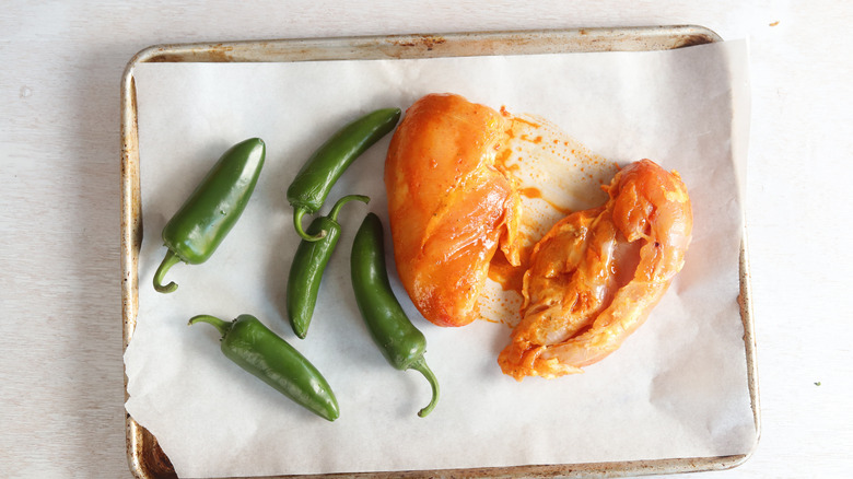 - Pour the marinated chicken onto a parchment lined baking sheet along with 5 jalapeños. Bake for 20 minutes or until the chicken reaches an internal temperature of 165 F.