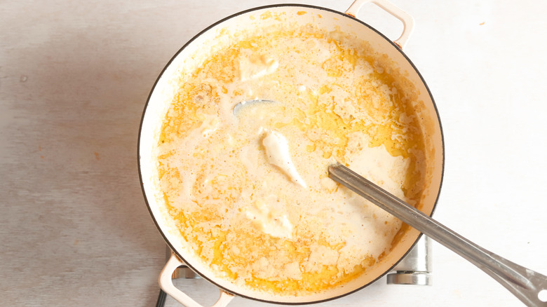 Add the chicken stock and heavy cream and simmer for 10 minutes.
