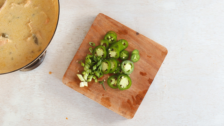 You'll start by marinating the chicken in lime juice and Sazon seasoning, then you'll roast it right alongside the jalapeños. The chicken is simmered with chicken broth and heavy cream for extra decadence. Cream cheese adds even more creaminess and serves as an ode to the jalapeño popper filling. Crispy bacon adds tons of smoky flavor and makes a perfect topping alongside the fresh jalapeños and chopped scallions.