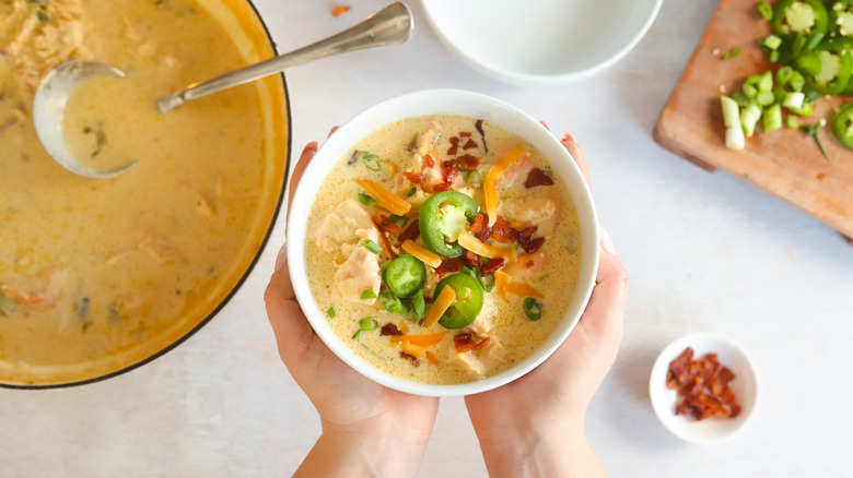 Jalapeño poppers are the ultimate party appetizer — cream cheese filling, crunchy bacon, all stuffed inside tender jalapenos. The flavors do not disappoint in traditional form, and the same goes when incorporated into this creamy white chicken chili, brought to us by recipe developer Leah Maroney.
