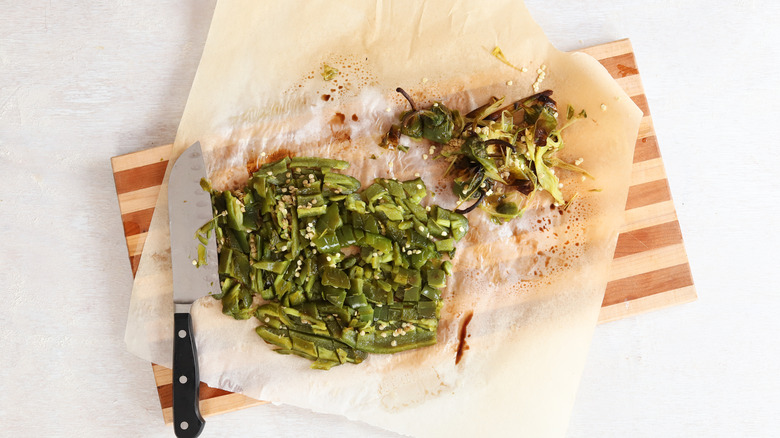 - Peel the skins off the jalapeños and dice. (Remove the seeds if you are looking for a less spicy chili).