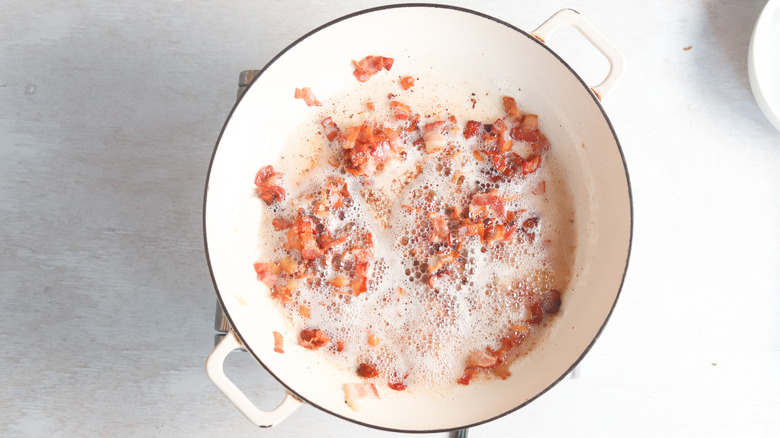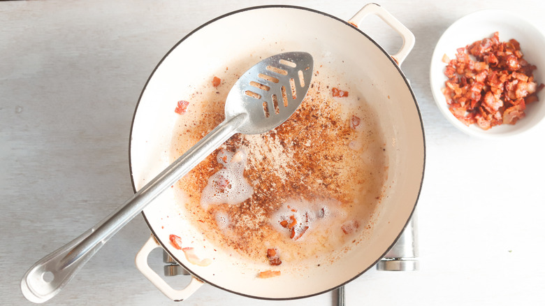 Add the diced onions and garlic to the grease and saute for 3-5 minutes or until softened.