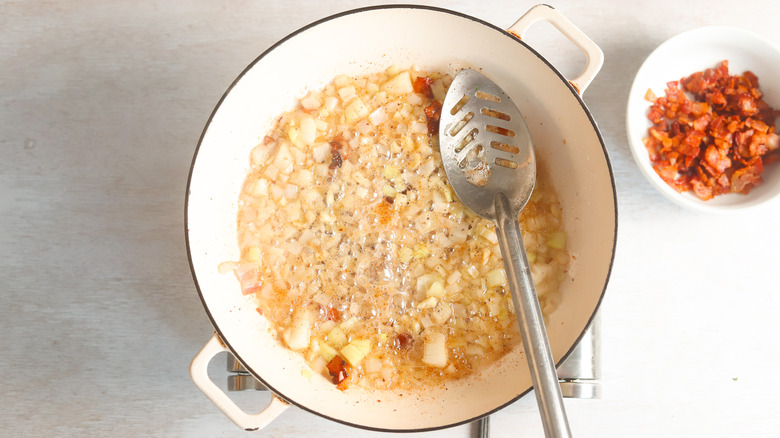 - Add the diced onions and garlic to the grease and saute for 3-5 minutes or until softened.