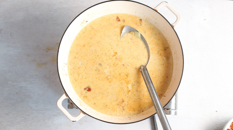 - Add the chicken stock and heavy cream and simmer for 10 minutes.