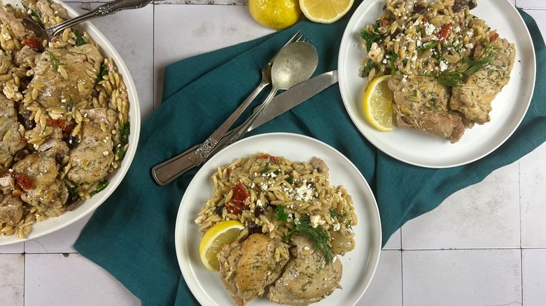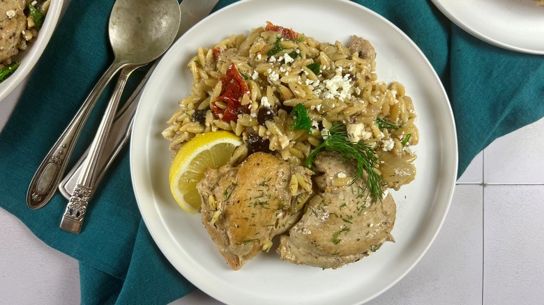 However you choose to serve the Crock Pot Greek lemon chicken and orzo, you need not feel as if you have to finish all of it the same day you cook it. This dish is an excellent one for meal-prepping purposes since, as De Witt tells us, "Leftovers will taste even better the next day after the flavors have had a chance to develop." She says the chicken and orzo ought to last for 4 days if kept in a resealable container in the refrigerator, although it can also be frozen for longer storage.